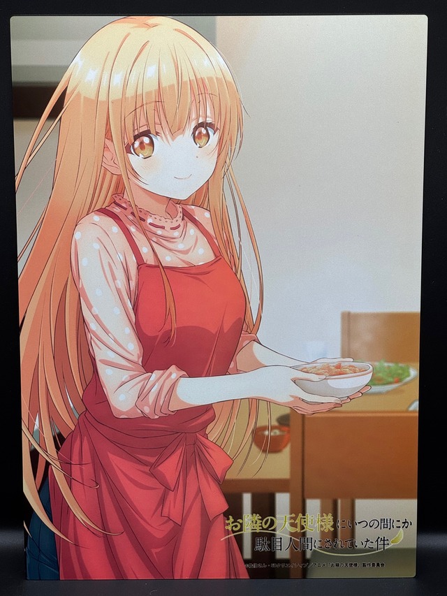 TVアニメ『お隣の天使様にいつの間にか駄目人間にされていた件 』より、エプロン姿の椎名真昼のイラストを使用したメタリアルグラフが登場! メタリアルグラフとはアルミプレートに特殊印刷を施した高級フォトパネルになります。 特殊コーティングされたアルミに特殊技法の印刷を施し、「光沢」「高精細」「美色彩」「奥行き」「立体感」を再現します。 さらに長期に渡り色褪せず、水や洗剤等で表面を洗浄で綺麗さが持続します。 【商品情報】 ☆サイズ 本体:A4サイズ相当 パッケージ:W30.9×D22.2×H1.9(cm) ☆素材:アルミ ☆加工:昇華転写 ☆パッケージ:専用BOX入り ☆付属品:組み立て式台座×1個、壁掛け用フックシール×2個 ©佐伯さん・SBクリエイティブ/アニメ「お隣の天使様」製作委員会