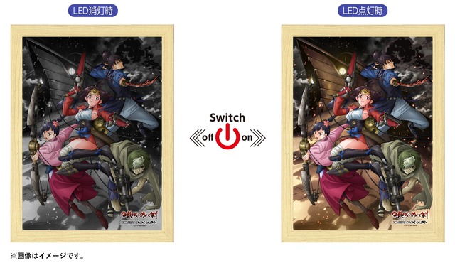 「甲鉄城のカバネリ」のアニメ放送開始10周年を記念してLapiPaが登場! LEDを点けるとモノクロの背景がカラーになります! 【商品情報】 ☆サイズ 本体:W21.5×H16.5×D3.4(cm) パッケージ:W25.7×H19.1×D6.4(cm) ☆素材:木・アクリル(アクリルは差し替え可能) ☆機能:LEDZ(テープ型内臓)、点灯式色味調整コントローラー付き ☆電源:USB Type-A対応 ☆パッケージ:専用BOX入り ©カバネリ製作委員会